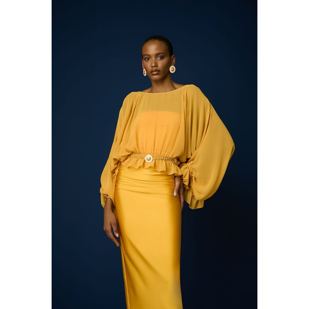 Confeccionada em tecido leve e translúcido, na sofisticada cor Golden Yellow, ela traz uma modelagem soltinha com decote canoa e mangas longas bufantes que esbanjam feminilidade. A cintura marcada por elástico com babados delicados cria um efeito peplum sutil, que valoriza a silhueta com charme. As mangas com punhos franzidos finalizam o design com sofisticação. Ideal para compor produções noturnas, eventos ou um visual chic com toque fashionista.