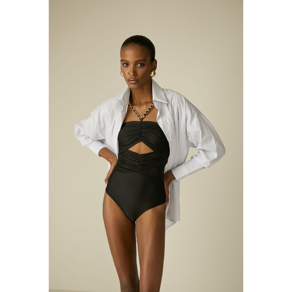 Com design moderno e sensual, ele traz recorte frontal estratégico que valoriza a silhueta, além de franzidos que criam textura e movimento no visual. As alças finas com detalhe torcido adicionam charme e um toque fashionista, enquanto a modelagem ajustada garante conforto e elegância. Na cor Black, o body é uma aposta versátil e atemporal, perfeito para transitar da praia para looks urbanos com facilidade.