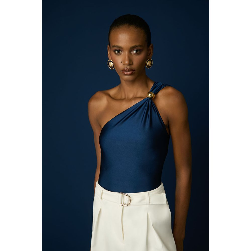 Com design assimétrico e alça única adornada por um delicado torcido no ombro, ele valoriza o colo e traz um ar sofisticado e contemporâneo à produção. Confeccionado em tecido confortável e com excelente caimento, o body modela o corpo com suavidade e estilo. Na cor Navy Blue, ele se torna ainda mais versátil, ideal para looks do dia à noite — seja com saias fluídas ou calças de alfaiataria.