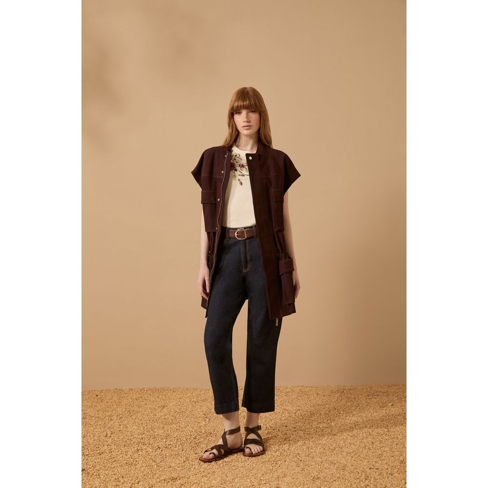 Confeccionado em couro estruturado na elegante cor Roxo Jabuticaba, ele aposta em uma modelagem utilitária e moderna, com comprimento alongado e abotoamento frontal por botões de pressão. Os bolsos frontais com aba reforçam a estética prática da peça, enquanto as mangas amplas tipo capa adicionam originalidade ao visual.