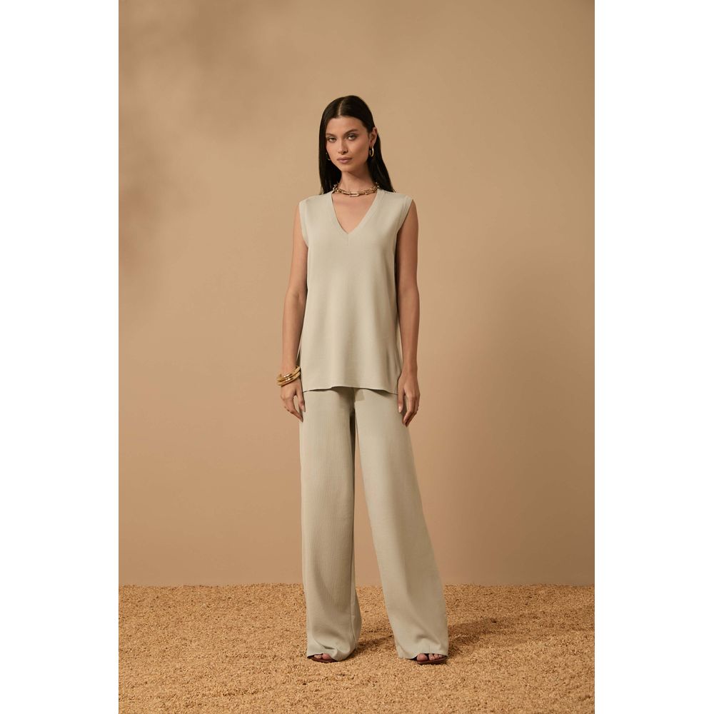 Feito em tricot leve e confortável, ele traz uma modelagem solta que valoriza a silhueta com sofisticação e praticidade. O top sem mangas com decote em “V” confere um ar moderno, enquanto a calça de caimento reto garante movimento fluido e atemporalidade ao look.
