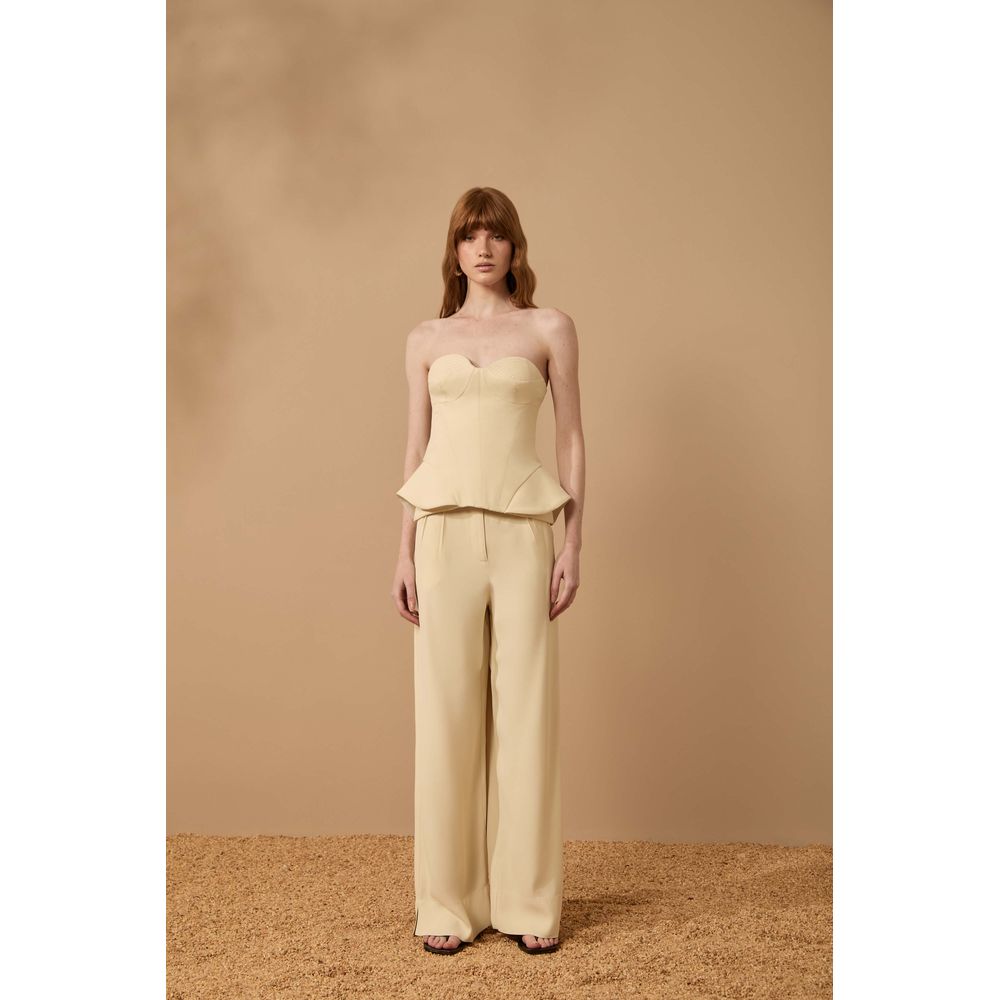 O Corset Melina na cor amarelo angu traz um toque vibrante e iluminado ao visual. Confeccionado em crepe de alfaiataria, apresenta bojo estruturado, recortes que valorizam as curvas e um delicado detalhe peplum na barra, que confere movimento e sofisticação. Uma peça versátil que pode ser usada para criar desde looks descontraídos e fashionistas até composições mais formais, garantindo sempre um ar moderno e elegante.