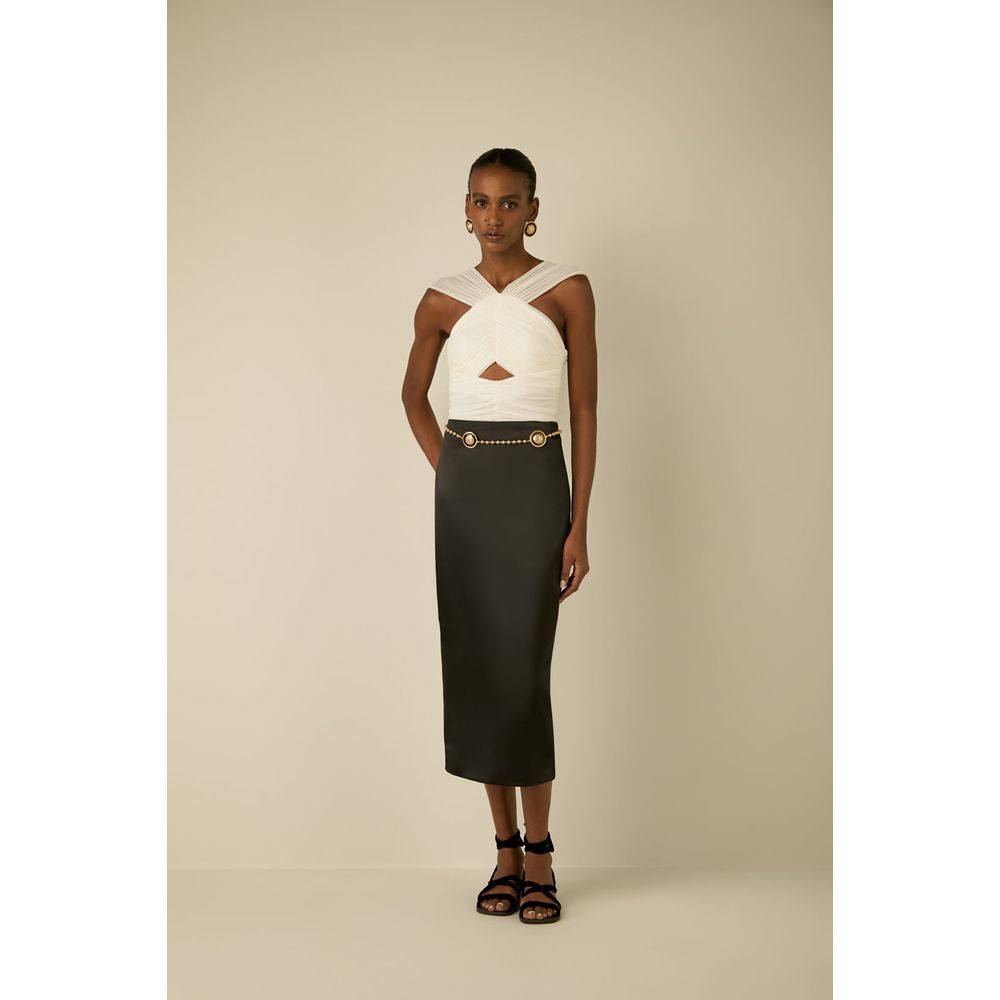 Feita em tecido acetinado de toque macio e caimento fluido, apresenta modelagem reta com comprimento midi, oferecendo um visual elegante e alongado. A cintura alta garante um ajuste perfeito e favorece a silhueta, enquanto a cor Black possibilita infinitas combinações, desde looks clássicos para o trabalho até produções sofisticadas para eventos noturnos.