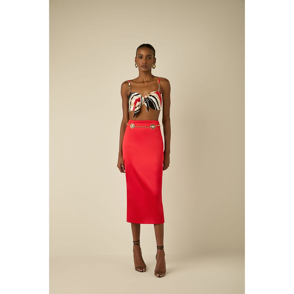 Confeccionada em tecido acetinado de caimento impecável, possui modelagem reta e comprimento midi, alongando a silhueta e proporcionando um visual refinado. A cintura alta valoriza a forma feminina, enquanto o tom vibrante Bright Red garante destaque e personalidade à produção. Ideal para combinar com blusas sofisticadas ou o Top Zaya, criando um look marcante para eventos e ocasiões especiais.
