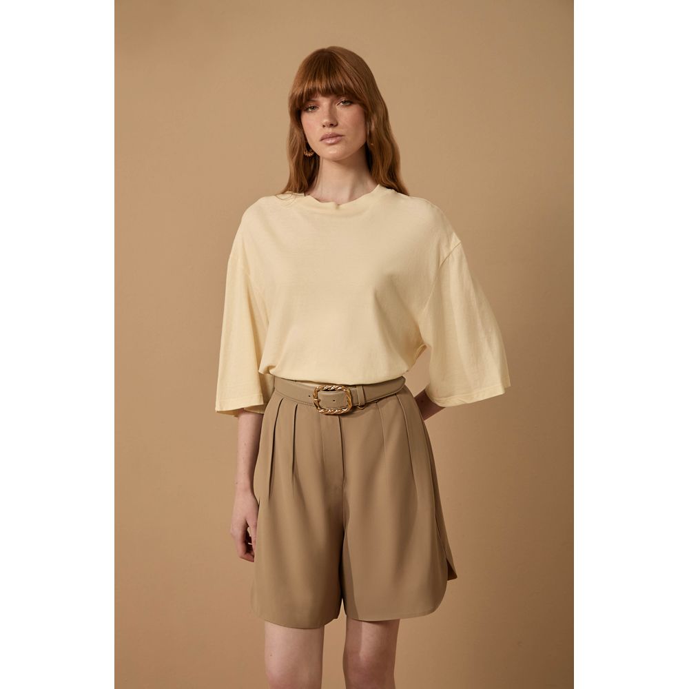 A T-shirt Eugênia é aquela peça curinga que une estilo e conforto em um só visual. Produzida em malha macia e respirável, conta com modelagem oversized que garante um caimento despojado e moderno. Suas mangas amplas e o comprimento mais solto proporcionam liberdade de movimento sem perder a personalidade. No tom Amarelo Angu, traz um toque vibrante e cheio de energia, perfeito para criar composições autênticas e iluminadas. Ideal para combinar com jeans, alfaiataria ou saias, garantindo um look casual com informação de moda.